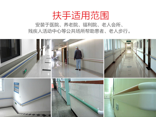 二、防撞扶手適用范圍: 安裝于醫(yī)院、養(yǎng)老院、福利院、老人會所、殘疾人活動中心等場所幫助患者、老人步行,同時保護墻體,防止餐車、潔車、藥車、推車、病床、輪椅等來自各方面的破壞性撞擊。