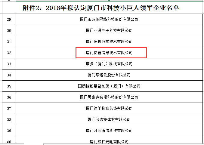 近日,快普獲“廈門市科技小巨人領軍企業(yè)”榮譽稱號,這是繼2017年獲得廈門市科技小巨人企業(yè)后,再次榮膺領軍企業(yè)行列。