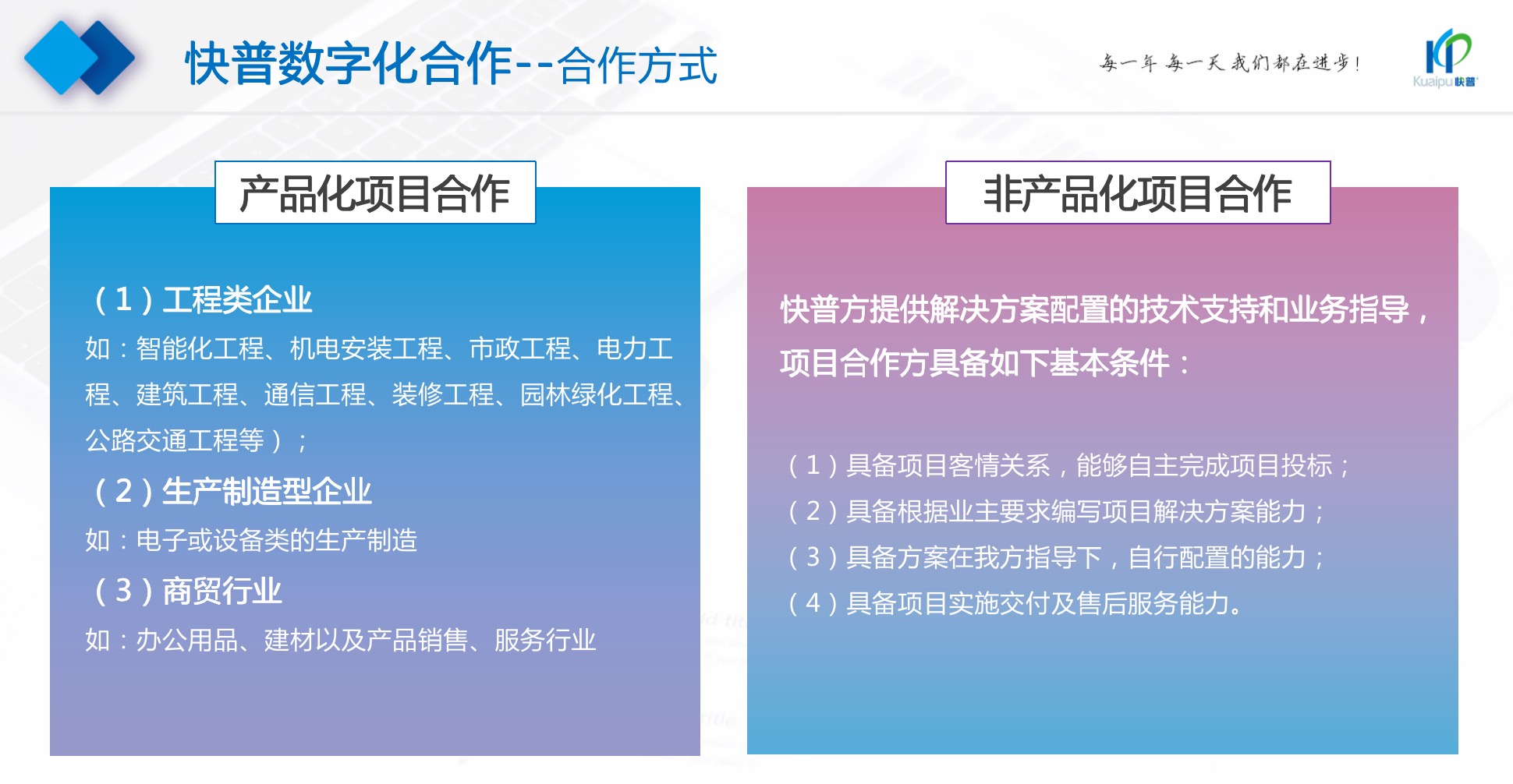 項目合作視合作方的貢獻度不同,再區(qū)分產(chǎn)品化和非產(chǎn)品化的項目合作,提供多種項目合作模式及分成比例。簽約產(chǎn)品代理具備ERP軟件業(yè)務(wù)擴展和實施交付能力,也可視承諾量OEM產(chǎn)品。