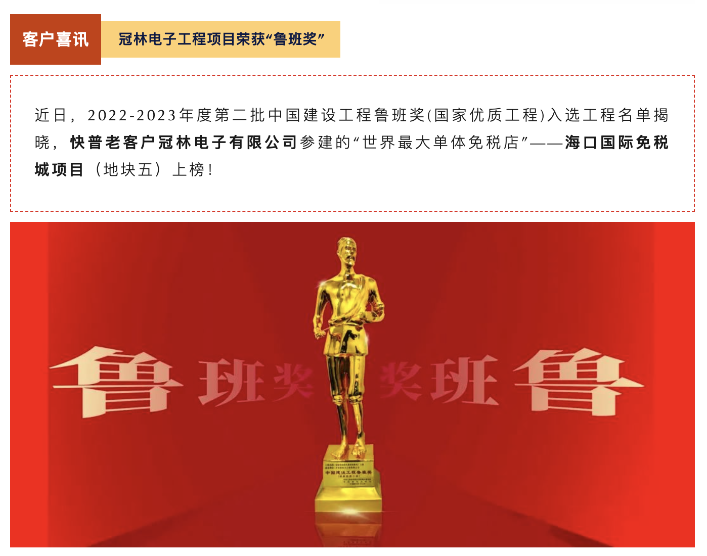 中國建設(shè)工程魯班獎(國家優(yōu)質(zhì)工程)是由中華人民共和國住房和城鄉(xiāng)建設(shè)部指導(dǎo)、中國建筑業(yè)協(xié)會實施評選的獎項,是中國建筑行業(yè)工程質(zhì)量最高榮譽獎,被譽為中國建筑業(yè)的“奧斯卡”,主要授予中國境內(nèi)已經(jīng)建成并投入使用的各類新(擴)建工程,且工程質(zhì)量應(yīng)達到國內(nèi)領(lǐng)先水平。