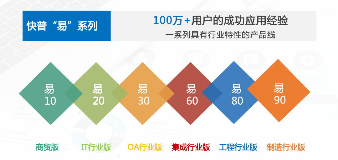 除易10之外,快普“易”系列同時(shí)推出了多個(gè)行業(yè)版本(如下圖),用“標(biāo)準(zhǔn)化+行業(yè)化+個(gè)性化”等特性解決企業(yè)大量個(gè)性化需求,從而幫助客戶高效率、低成本地實(shí)現(xiàn)數(shù)字化轉(zhuǎn)型升級(jí)。